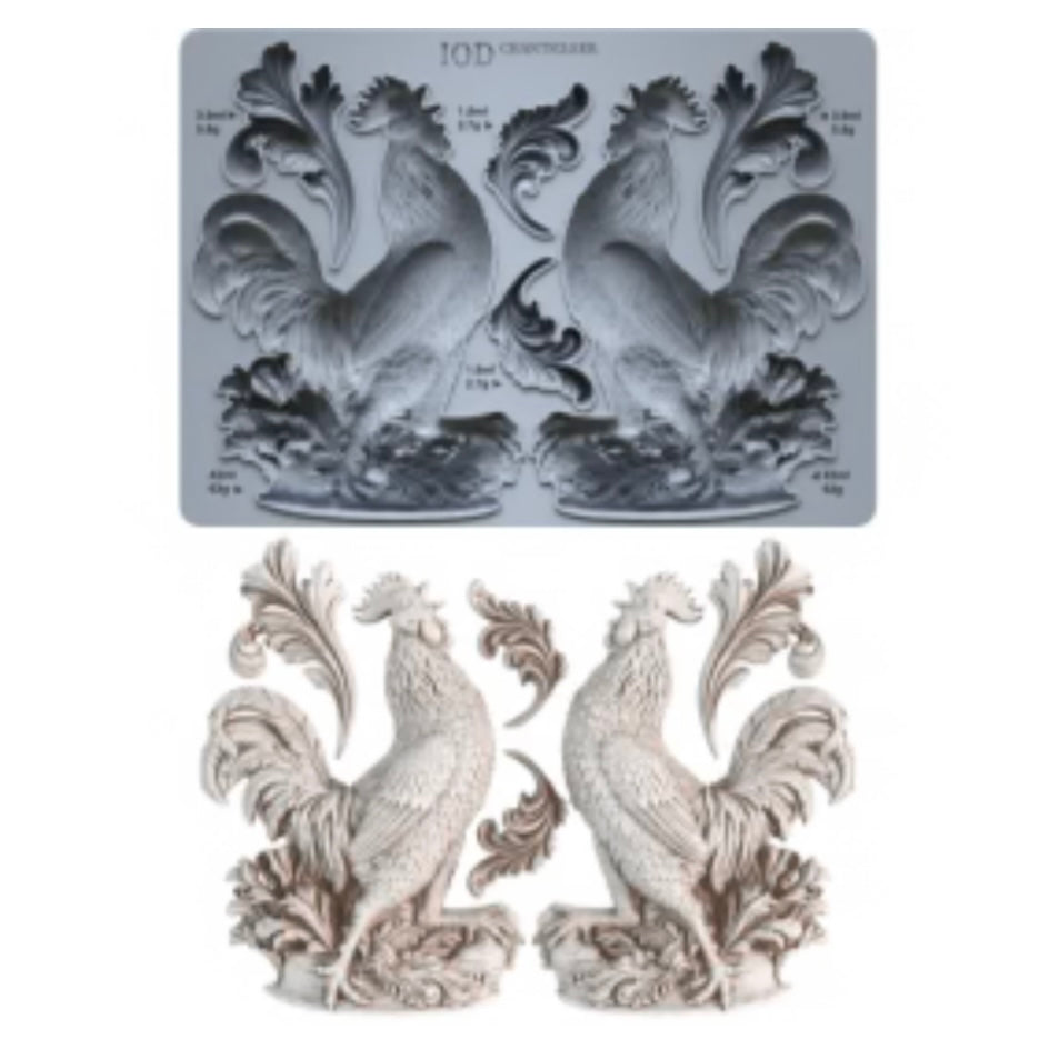 Chanticleer would make a stunning statement on an IOD Arched Wood Blank in a cozy kitchen nook or strutting his stuff on either side of a set of vintage bookends. If you're dreaming up something more grand, Chanticleer pairs beautifully with the Heraldry Mould for an aesthetic that's both regal and rustic. Let him stand strong as a standalone focal point in your projects or serve as a solid base for composing a more grand relief.