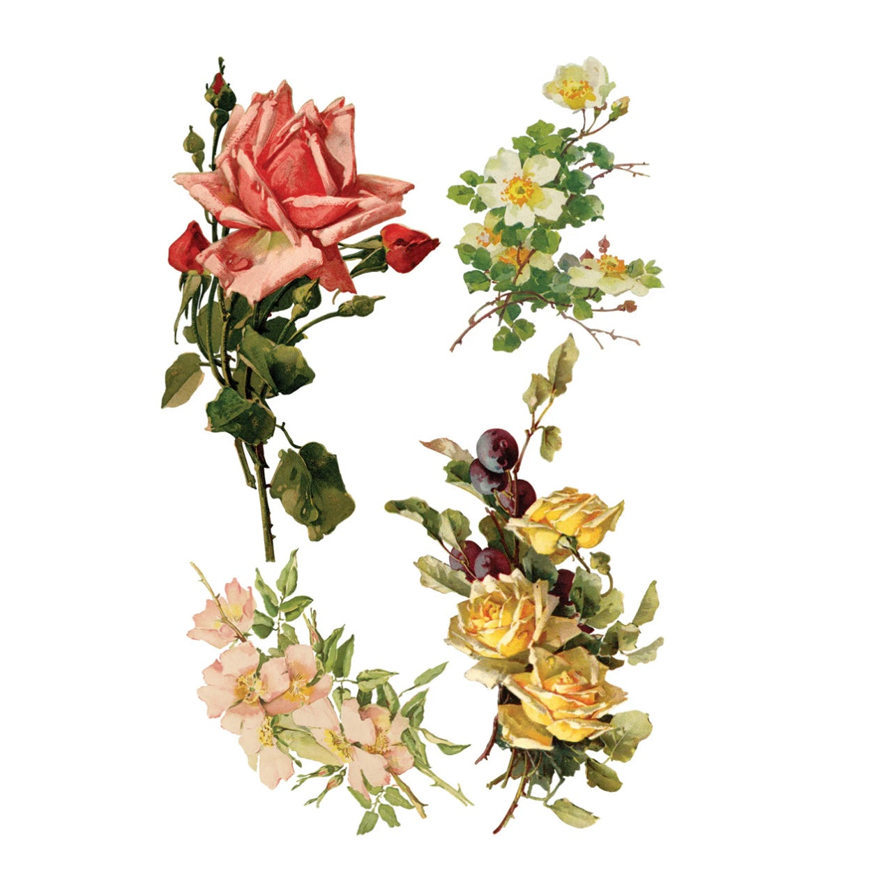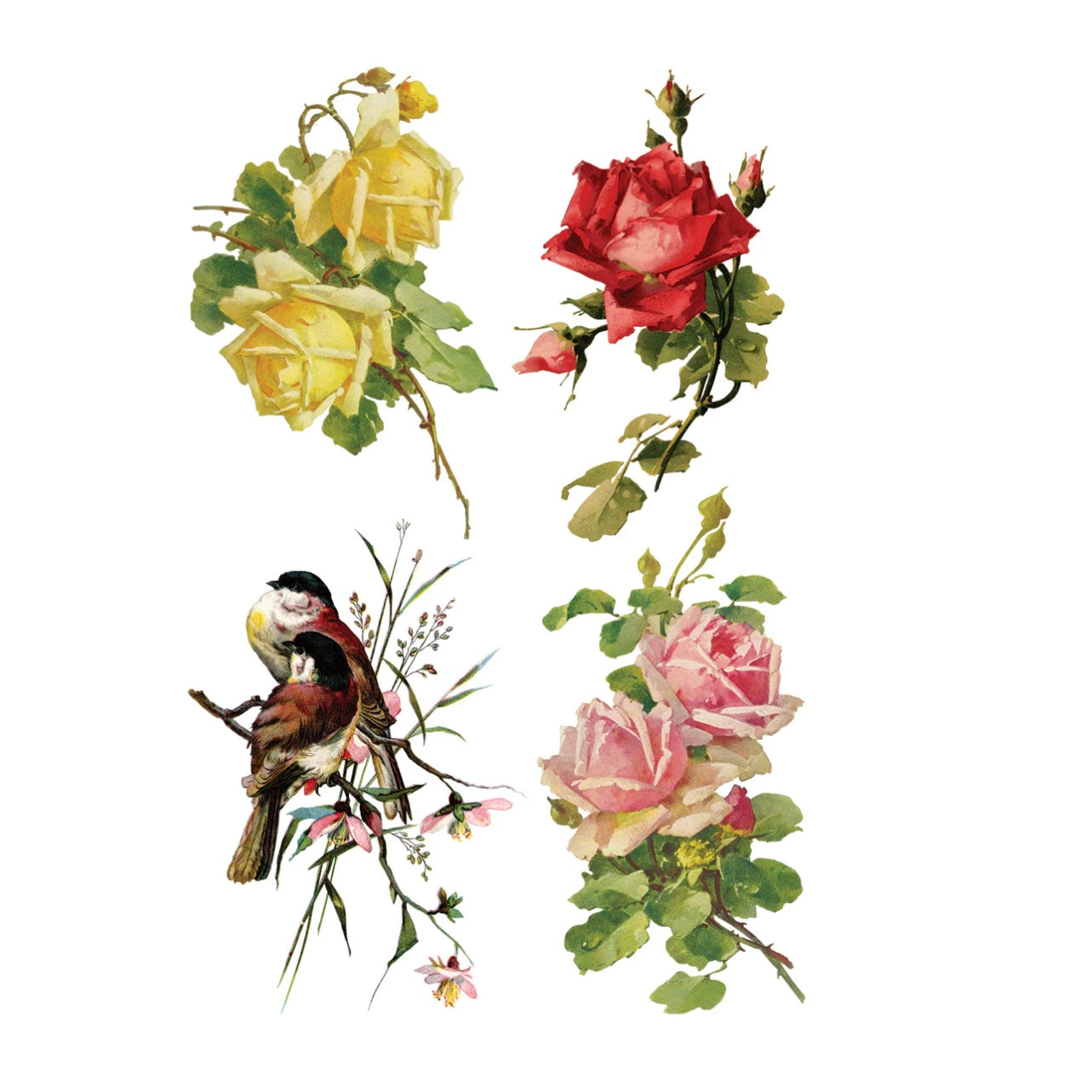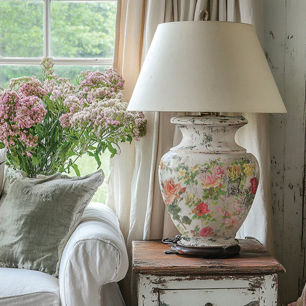This transfer features sumptuous blooms with exquisite details and soft, painterly touches reminiscent of her signature style. From sprawling roses to charming bouquets and sweet handpainted birds perched on their branches, the Catharina Transfer is brimming with whimsy and natural beauty.