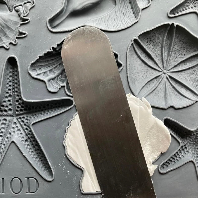 Artist grade Iron Orchid Designs air dry clay is a beautifully soft and pliable air dry medium that works well in our moulds. Like most paper pulp based air dry clays, some shrinking, warping, and cracking is inherent. We like these qualities for a distressed, authentically vintage look. Our favorite way to apply moulded pieces is to remove them from the mould while still moist, and adhere to the surface with the appropriate glue so it conforms well. For vertical surfaces, use a piece of low tack tape to hold it in place so it doesn’t slip.