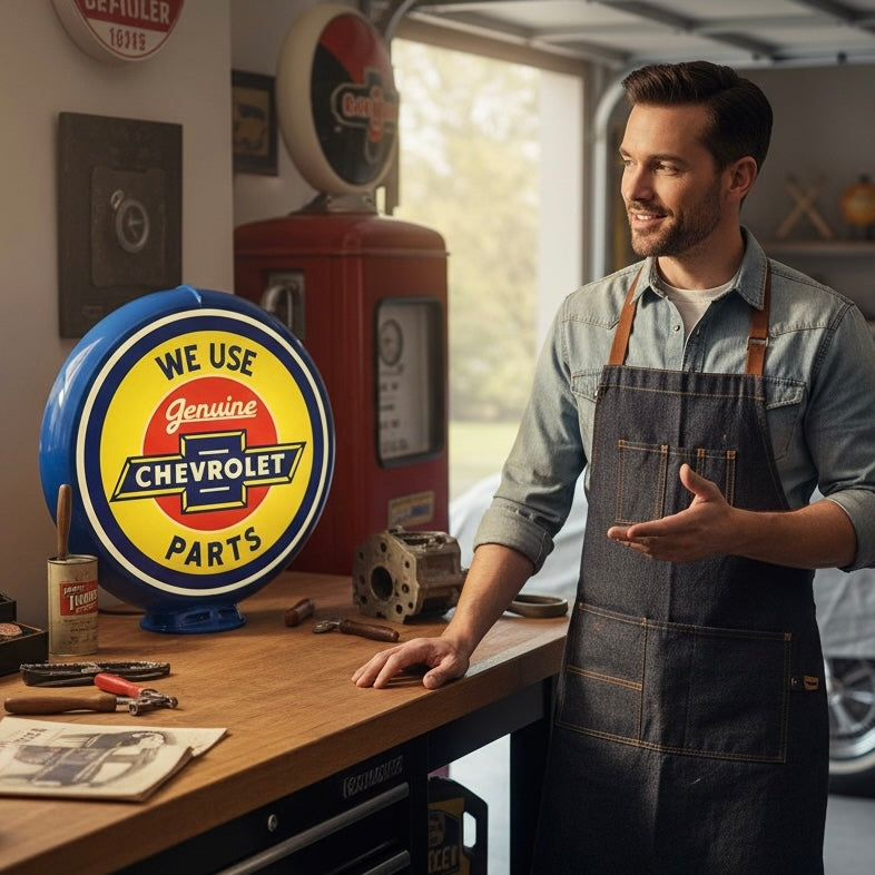 This Chevrolet reproduction gas pump globe consists of a solid color plastic casing with two flat plastic lenses. Lenses can be rotated so that the globe may be positioned as shown, mounted against a wall, or hung from the ceiling. Plastic lenses are 13 1/2”. Total height is 16 1/2”. The base opening is 6” in diameter. Made in America. This Chevrolet globe will fit most replica and antique gas pumps. Shipped assembled. The globe does not light up on its own. Light kit sold separately.