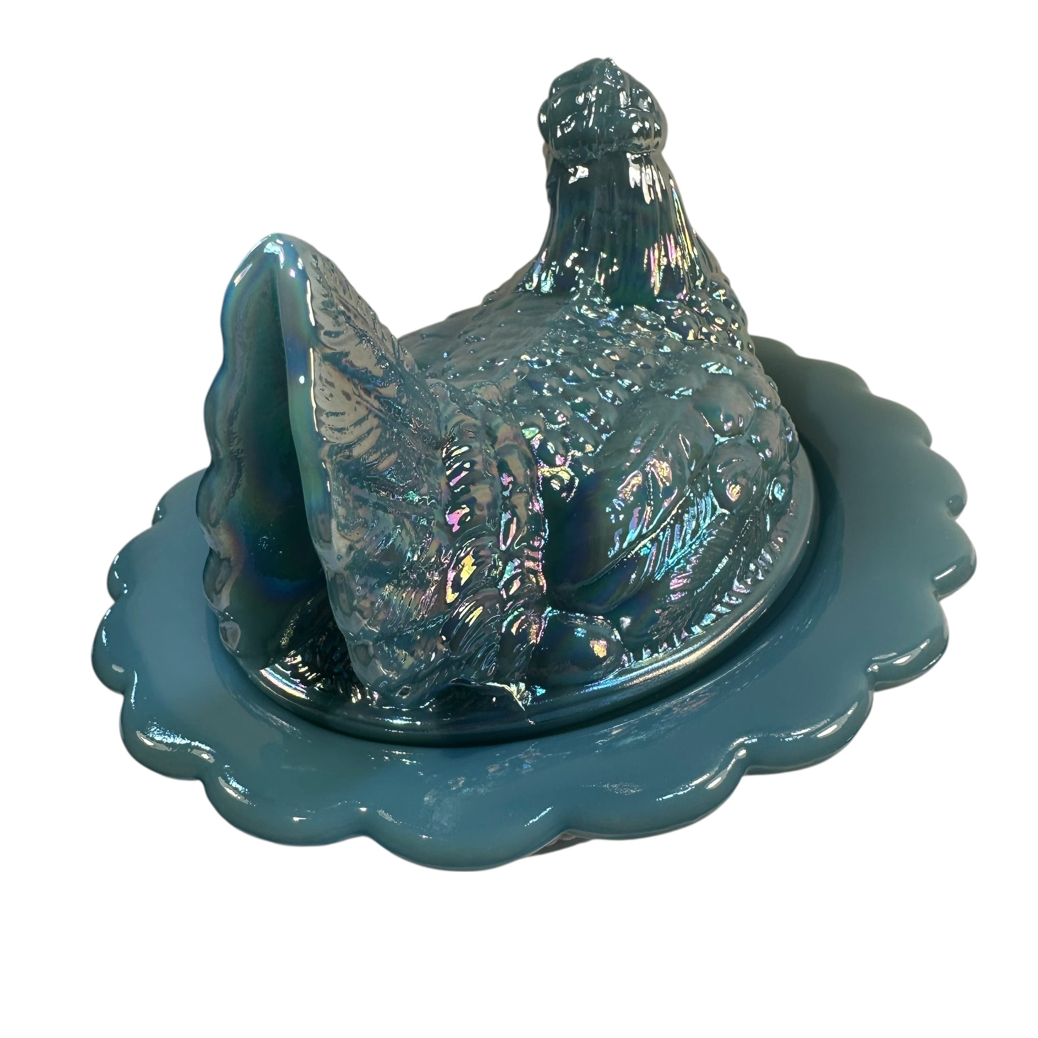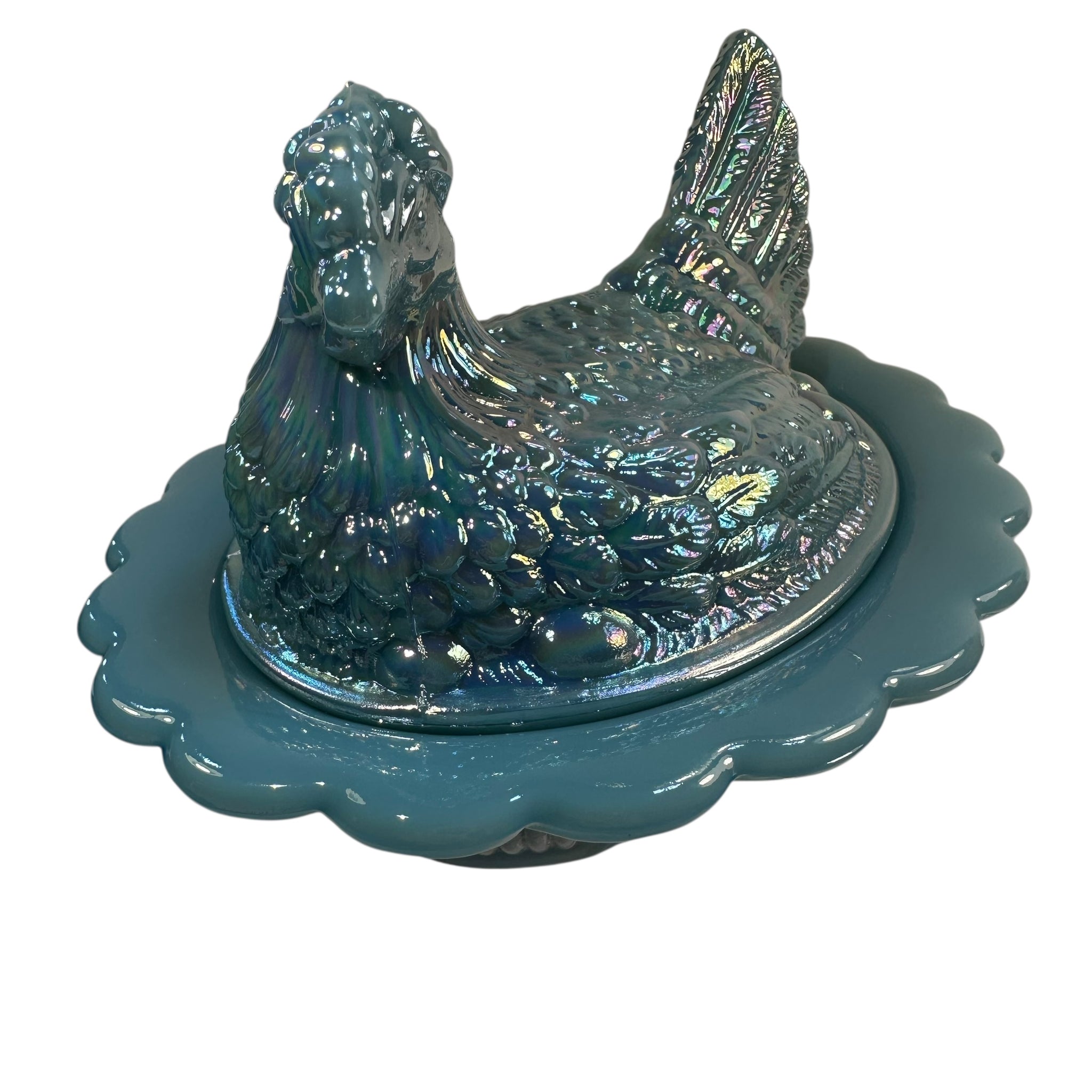 Mosser hen on nest, 2 pieces Carnival Georgia Blue 7” USA made Vintage farmhouse style Iridescent New No box |